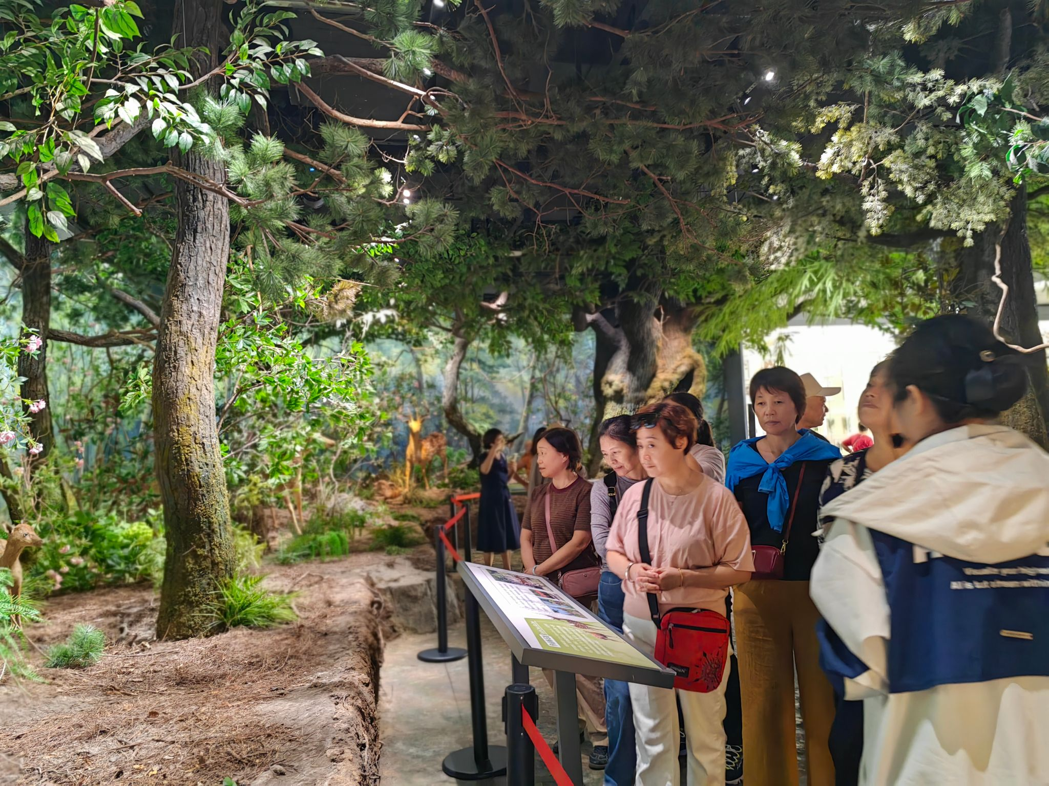 午后,队伍抵达天目未来谷生态研学馆,硕大的地球模型开篇点题,带领大家探寻生命演化的密码,东北虎、大熊猫等珍稀动植物标本栩栩如生,让老同志们近距离感受生物多样性的魅力。天目山—清凉峰世界生物圈保护区的仿生场景中,“大树王”的苍劲与野生梅花鹿的灵动被生动还原,在巨型环形曲线LED屏幕上,全球748个生物圈保护区的高清画面缓缓流淌,从长白山到亚马逊雨林的壮美风光尽收眼底,沉浸式的视觉体验赢得阵阵赞叹。